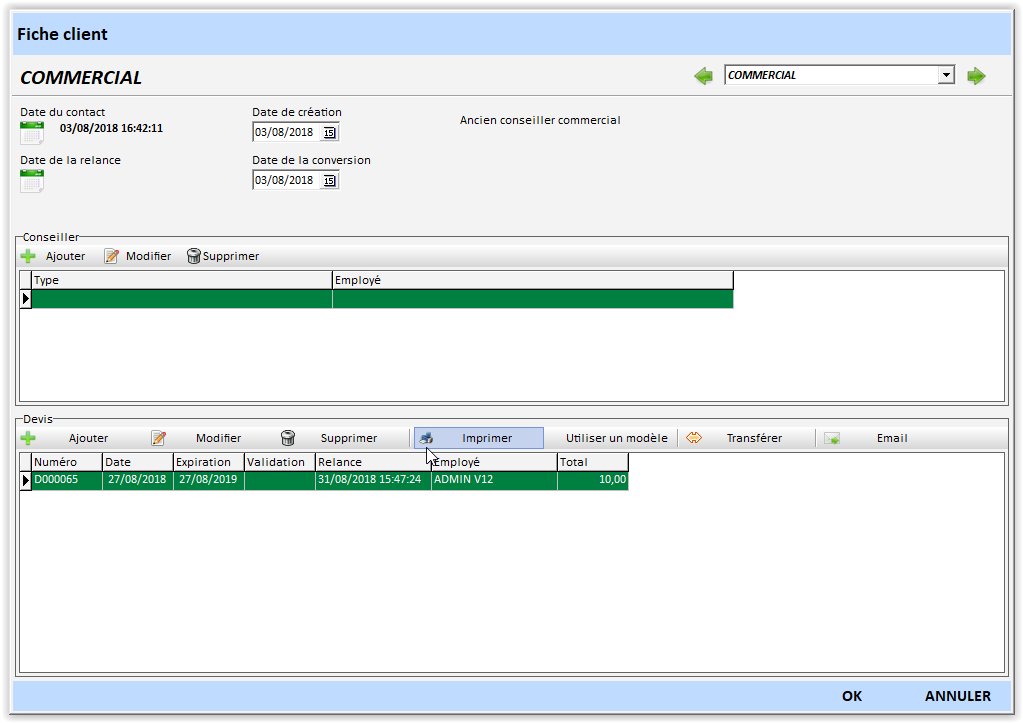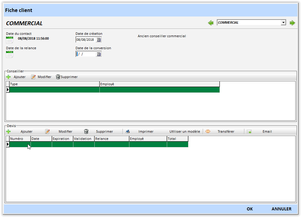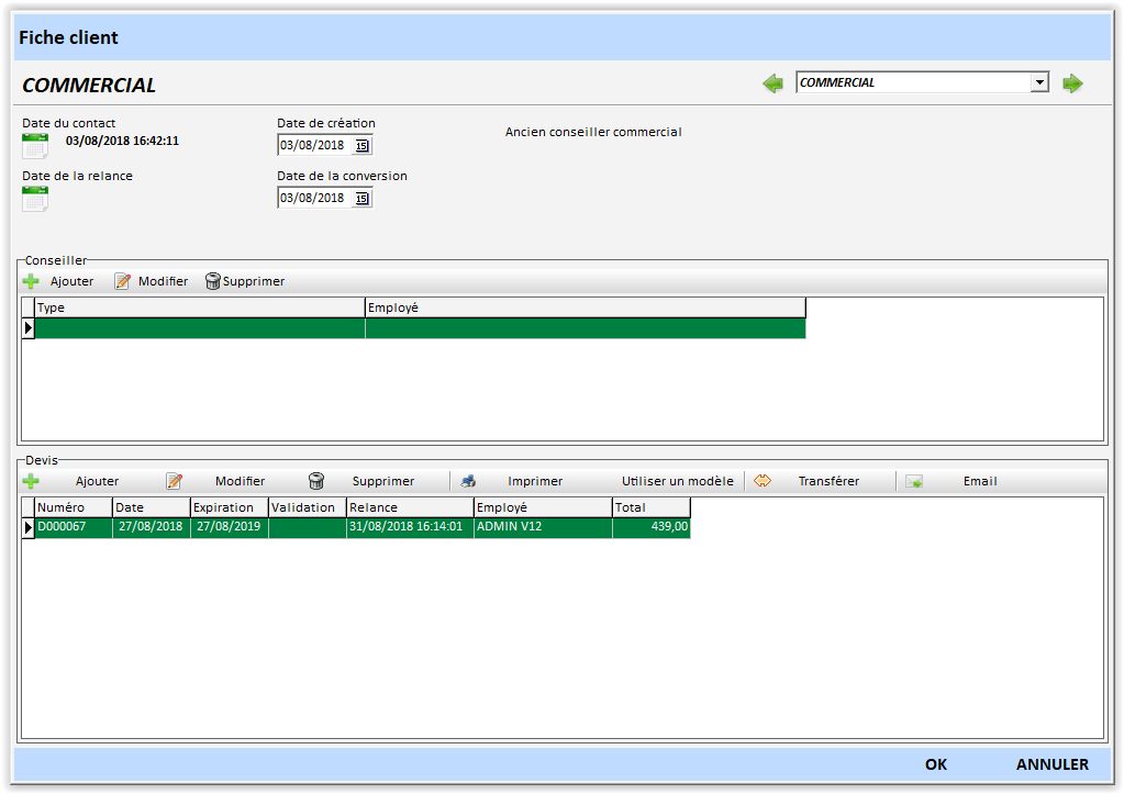 - Une date de relance : par exemple permet d’éditer des statistiques automatiques sur la relance des devis.
