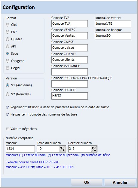Compte TVA, VENTES, CAISSE, CLIENTS, ASSURANCE, REGLEMENT PAR CONTREMARQUE, SOCIETE: valeurs par défaut pour ces comptes si ceux-ci ne sont pas renseignés.